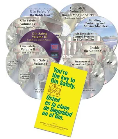 Once we receive that information we will mail you the materials along with an invoice to cover the costs. Please make checks payable to the National Cotton Ginners Association and include the phrase “Videos and Publications” on the memo line. The cost is $10.00 for each volume of the videos and $0.65 for each copy of the “You’re the key to Gin Safety” brochure. Also available is a thumbdrive that includes volumes I-VIII in both English and Spanish for $40.